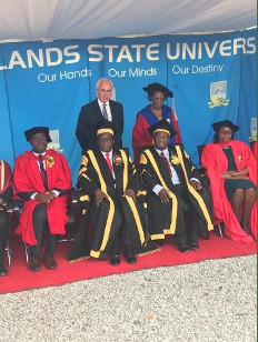 Commonwealth Lawyers Association President Mr Brian Speers in discussions with H E President E D Mnangagwa, who is Co-Patron of the Midlands State University Fundraising Committee since 2009. This photo was taken after the MSU graduation ceremony, November 2019.